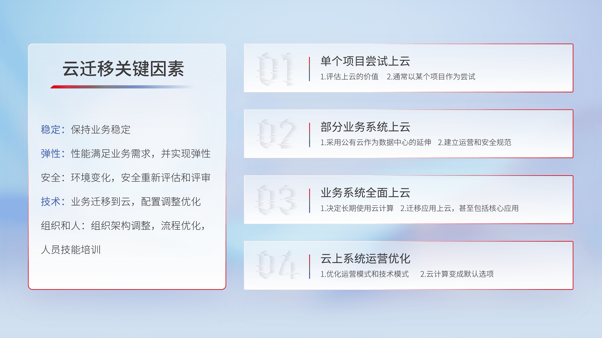 结合实际业务,,,从规划设计、、云平台选型、、云原生改造、、、数据迁移、、、集成交付,,迁移全过程为客户识别最佳上云路径,,,做好风险识别管理,,设计网络架构、、身份权限、、、、安全审计合规、、、操作审计、、、、日志审计、、、、监控告警策略、、、多站点容灾设计等,,对云上基础设施进行整体规划,,,,提升IT治理水平,,,,以满足弹性、、、高可用、、高性能的需求。。。。